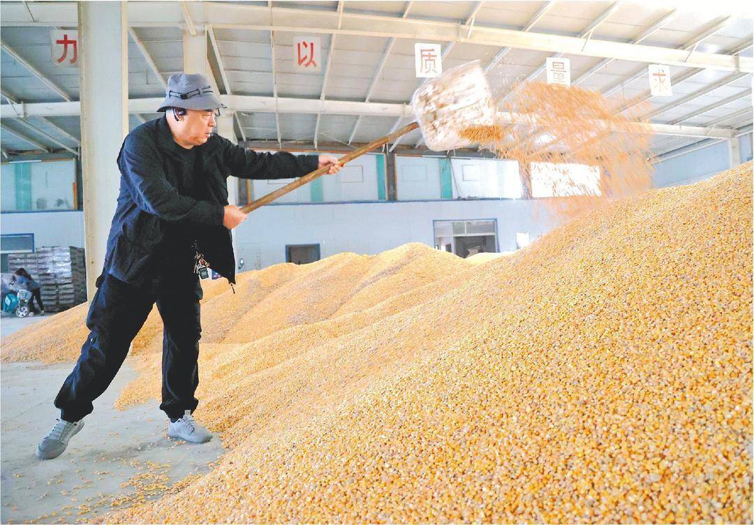 10月10日,在滨州高新区小营街道一处粮食烘干服务点,工作人员整理烘干后的玉米。(□新华社发 )
